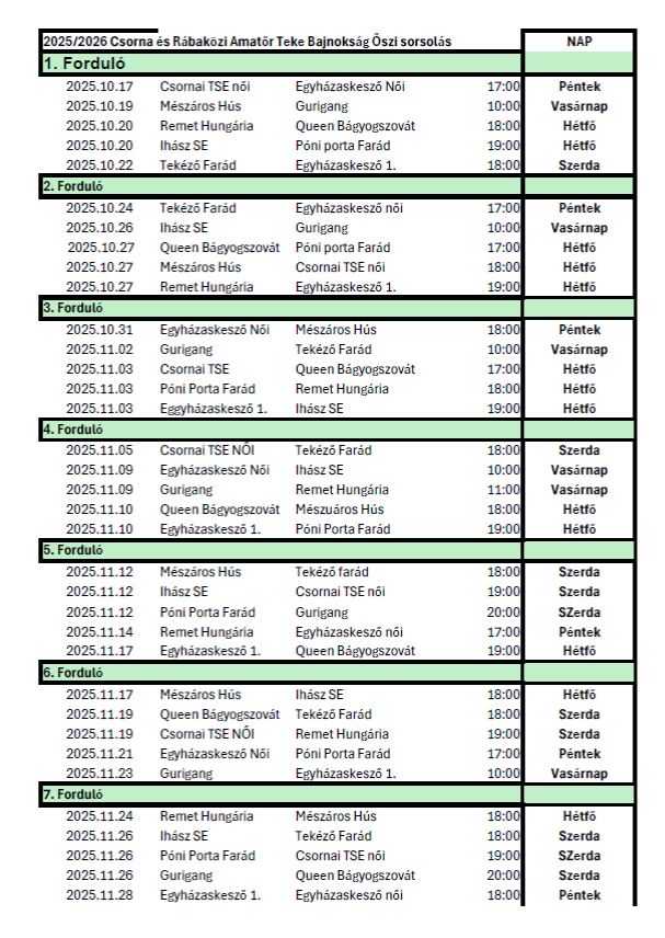 2025-ben indítottuk útjára a Csornai és Rábaközi Amatőr Teke Bajnokságot, amelynek célja, hogy a környék tekézői számára egy szervezett, sportszerű és közösségépítő bajnokságot teremtsünk.